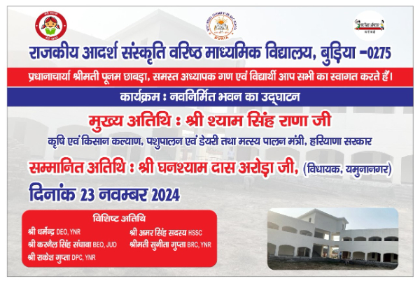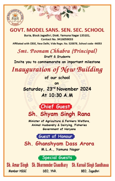 School organised Inauguration Function of its New Building on 23 Nov. 2024. Chief Guest: Sh. Shyam Singh Rana, Agriculture and Farmer's Welfare, Animal Husbandry and Dairying & Fisheries Minister Guest of Honour: Sh. Ghanshyam Dass Arora, M.L.A Yamuna Nagar Special Guests: Sh. Amar Singh, Member HSSC, Sh. Dharmender Chaudhary, D.E.O, Yamuna Nagar, Sh. Karnail Singh Sandhawa, B.E.O, Jagadhri